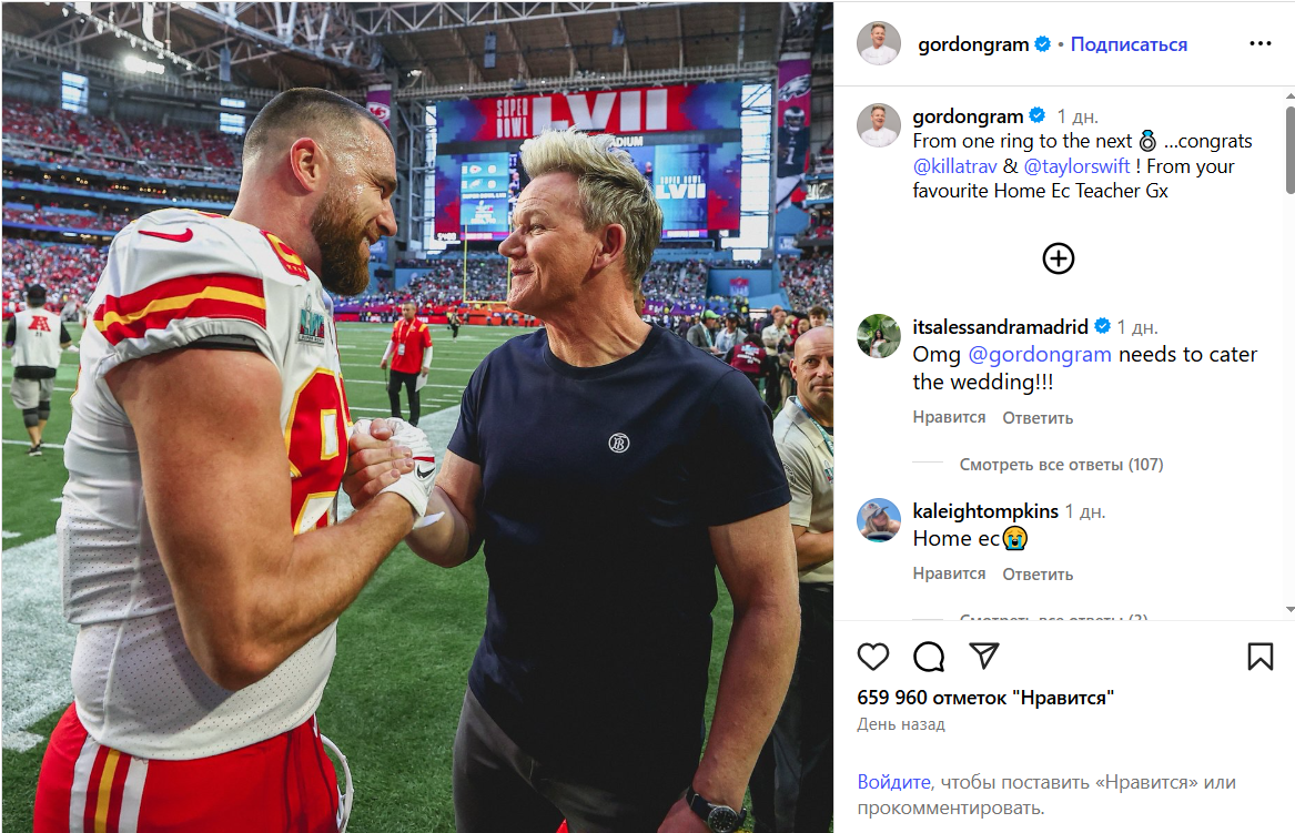 Популярный шеф-повар Гордон Рамзи опубликовал фото 2023 года, на котором поздравляет Келси с победой на чемпионате НФЛ: