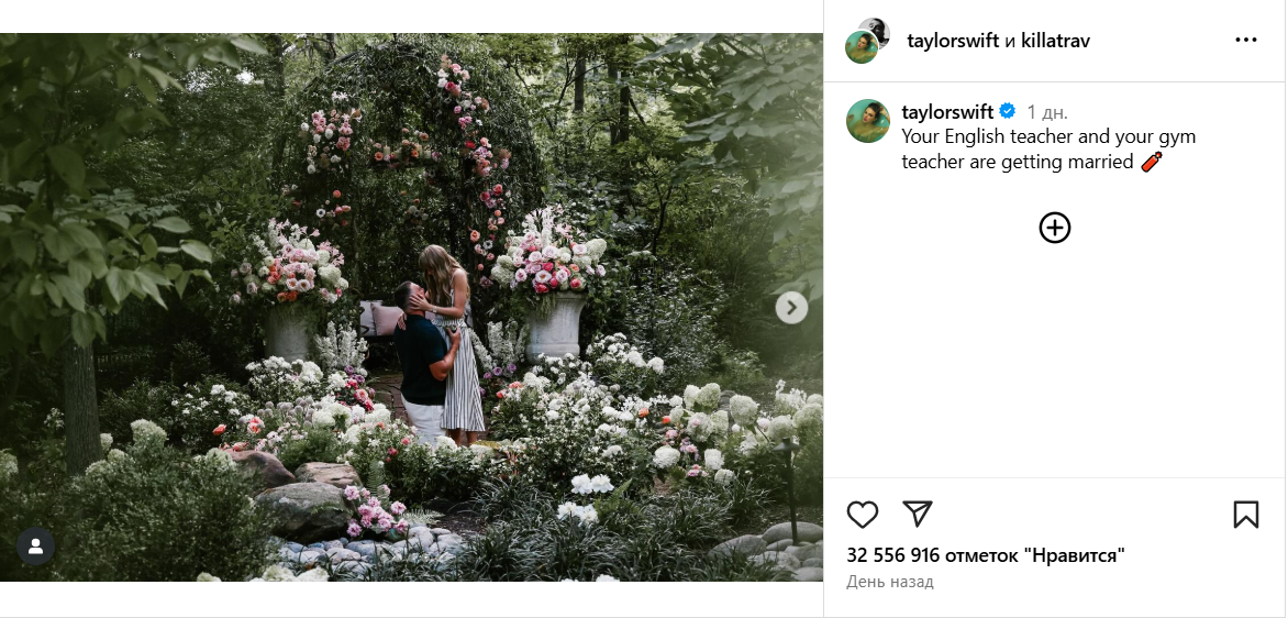 Трэвис и Тейлор опубликовали несколько снимков, на которых обнимаются в цветочном саду, с подписью: «Ваша учительница английского и ваш учитель физкультуры женятся».