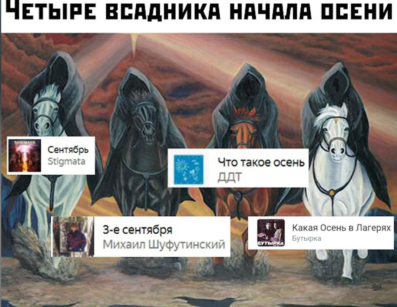 С 2017 года к «календарным» мемам подключились и другие осенние треки – «Сентябрь горит» группы Stigmata и «Что такое осень» ДДТ. Они тоже стали сезонными, пусть и в меньших масштабах: популярность «костров рябин» затмить сложно.