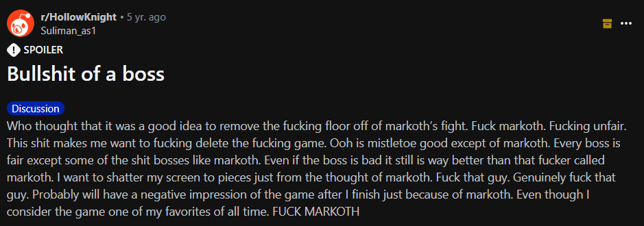 💬 «Кто вообще додумался убрать чертов пол из боя с Маркотом? К черту Маркота. Это гребаное дерьмо нечестное. Из-за него так и хочется удалить игру к чертям. Да, игра прекрасна, но только не с Маркотом. Все боссы честные, кроме таких дерьмовых, как Маркот. Даже если босс неудачный, он все равно в сто раз лучше этого урода по имени Маркот. Мне хочется разнести экран в щепки только от одной мысли о нем. К черту этого типа. Честно, к черту его. Наверное, у меня останется плохое впечатление об игре только из-за Маркота, хотя я считаю ее одной из лучших игр всех времен. К ЧЕРТУ МАРКОТА».