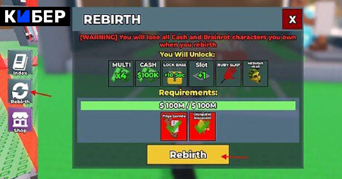 Вне зависимости от уровня, когда вы подготовите все свое добро, кликните по кнопке Rebirth слева на экране. Убедитесь, что у вас всего хватает, и нажмите еще раз кнопку Rebirth. Готово – теперь вы поднялись по лестнице уровней, но начинать будете свой путь в Steal a Brainrot с чистого листа.