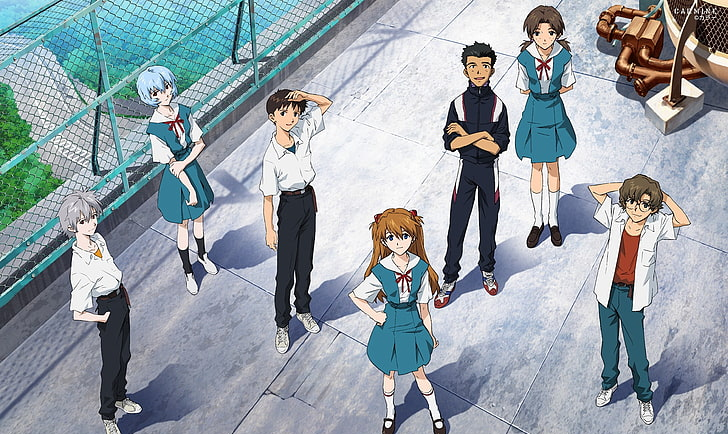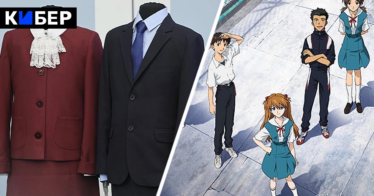 У формы в «Евангелионе» силуэт предельно простой. Девочки носят белую блузку с короткими рукавами, синюю юбку-сарафан с высокой талией и красный галстук-ленту. Юноши – белую рубашку и черные брюки. Контраст белого, синего и красного уже выделяет эту форму среди прочих.