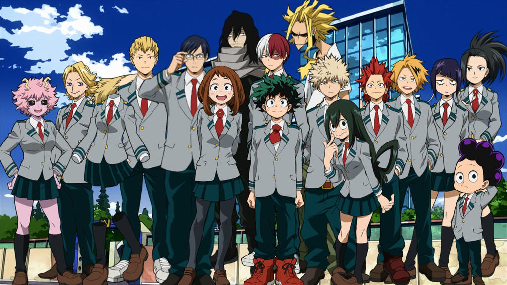 Серый пиджак, белая рубашка, темно-бирюзовые брюки или юбка и красный галстук – сдержанно и симпатично. Ученики носят форму свободно, добавляя детали на свой вкус. В школе, где готовят будущих героев, одежда должна быть удобной. Поэтому в аниме есть и спортивный костюм в фирменных цветах, который стал таким же узнаваемым, как основная форма.