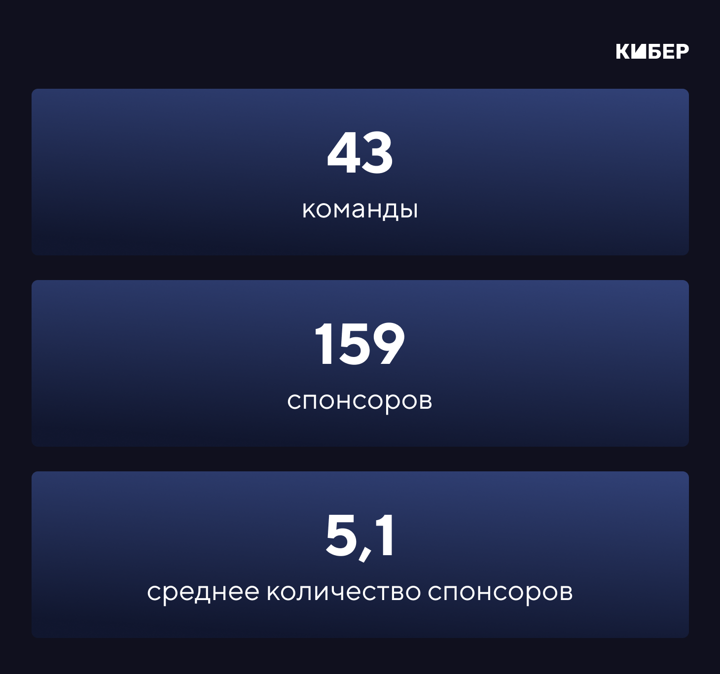 В итоге мы нашли у 43 команд 220 спонсоров (из них 159 поддерживают сразу несколько команд). В среднем у каждой организации по 5,1 партнера.