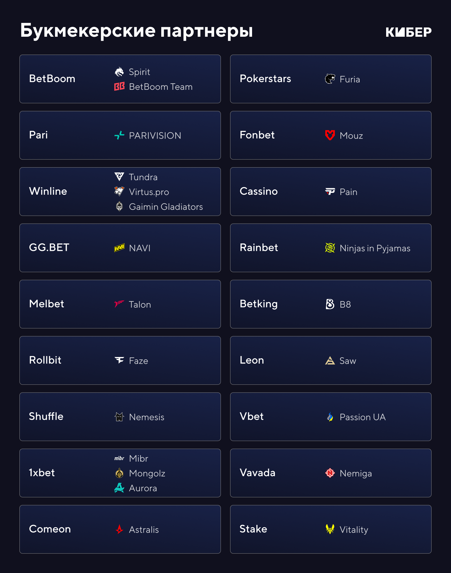 Больше половины команд в исследовании имеют партнера-букмекера. Большинство эксклюзивно сотрудничают только с одной организацией, но три букмекера подписали несколько команд: BetBoom со Spirit и BetBoom Team, Winline (Tundra, Virtus.pro и Gaimin Gladiators) и 1xbet (MIBR, Mongolz и Aurora) имеют на контракте по три команды.