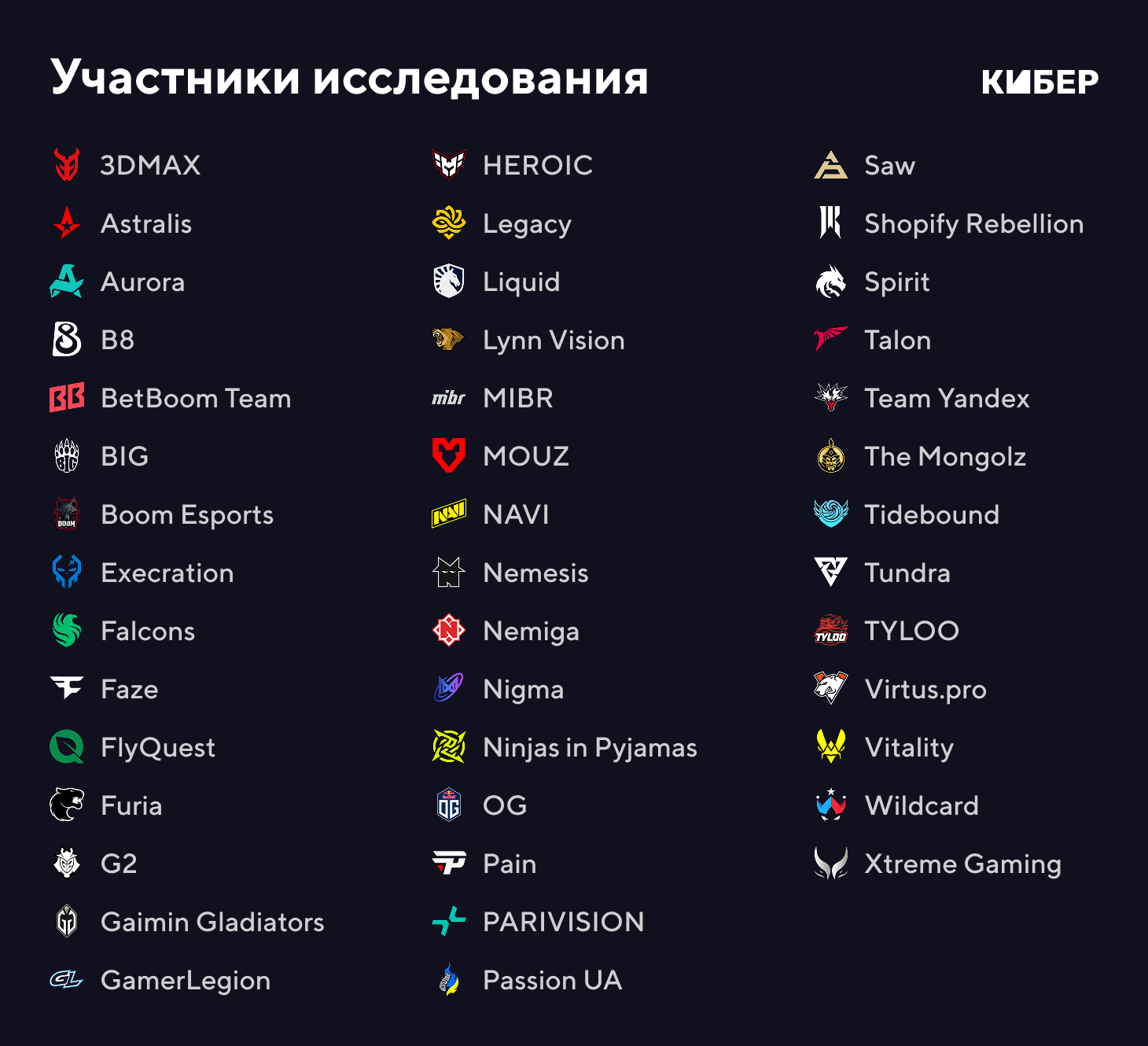 В исследование попали 43 киберспортивные организации: участники The International 2025 и EWC 2025 по Доте, а также команды из топ-30 рейтинга HLTV по CS 2. Стоит уточнить, что вместо Complexity мы учли данные по Passion UA, потому что, по слухам, именно эта организация выкупит контракты игроков и займет место Complexity в рейтинге.