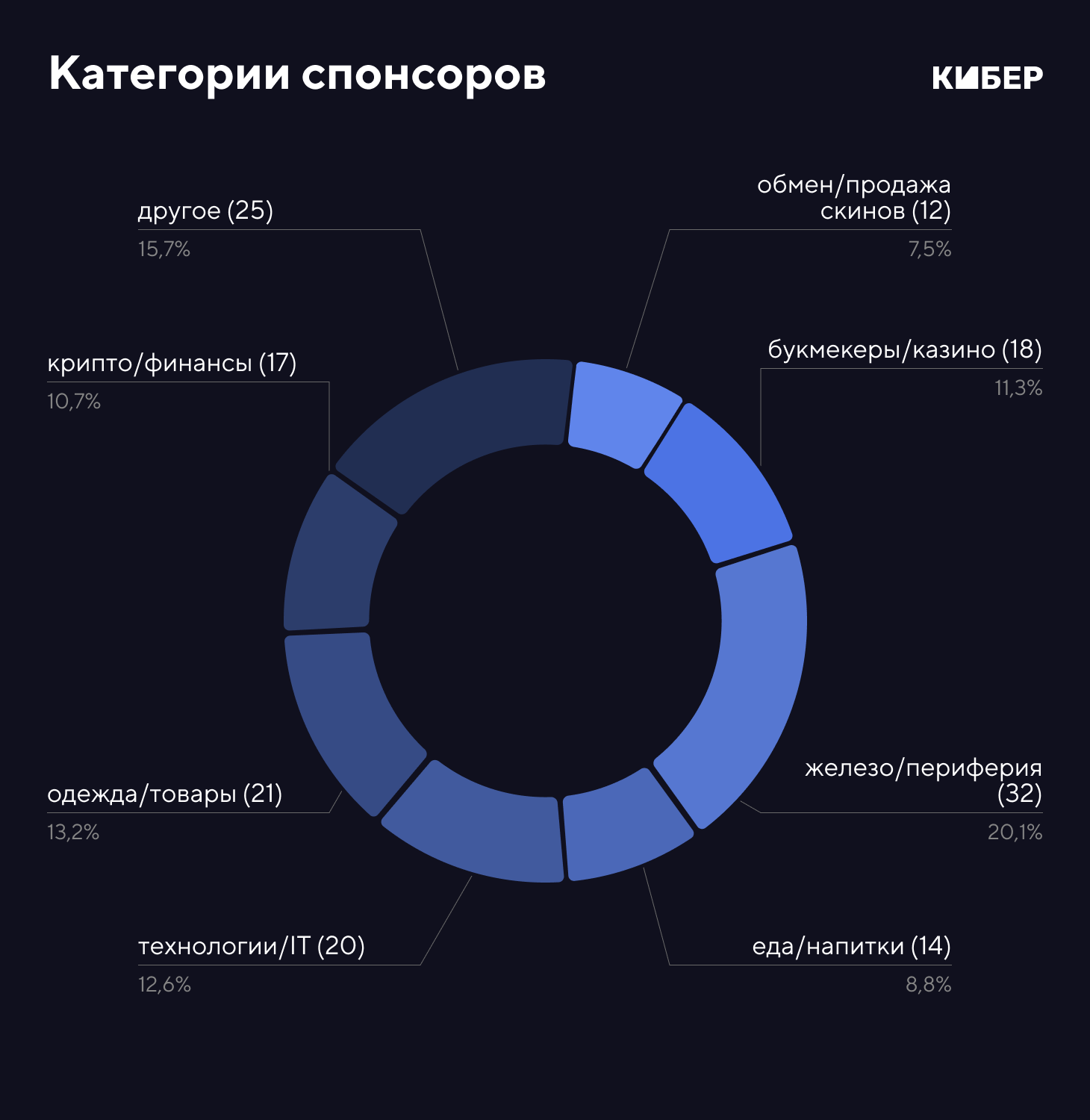 «Букмекеры и казино» только на четвертом месте по количеству компаний, но при этом у 23 из 42 команд есть партнер из сферы азартных игр. Даже если добавить к букмекерам сайты по обмену и продаже скинов, которые находятся в серой зоне, то объединенная категория не попадет на первую строчку.