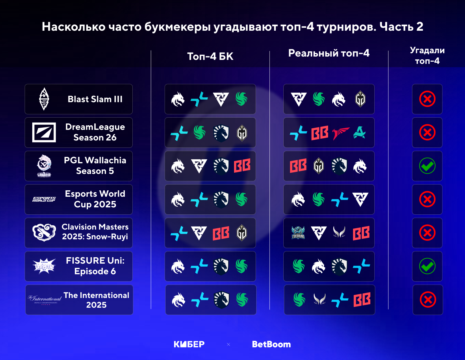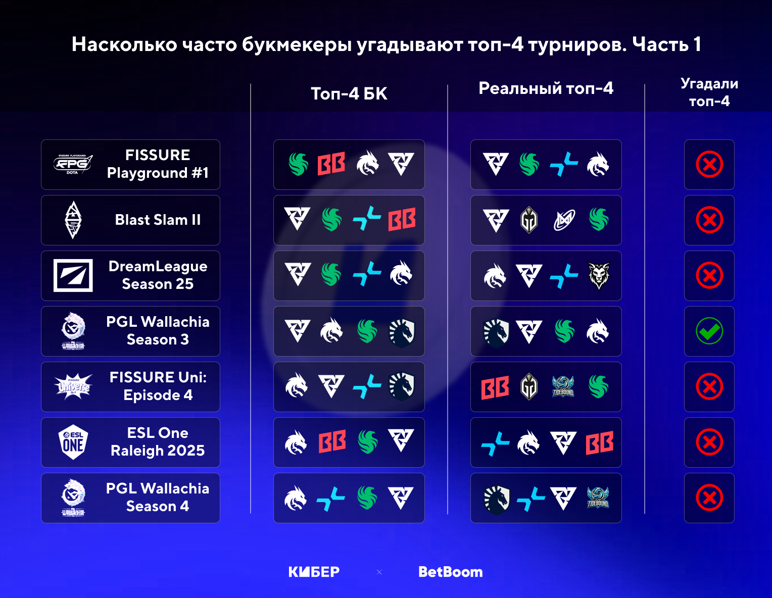 ➢ В предсказании топ-4 аналитики BetBoom по Доте чуть успешнее коллег по CS: 3 точных прогноза из 13 против 3 из 15 по CS.