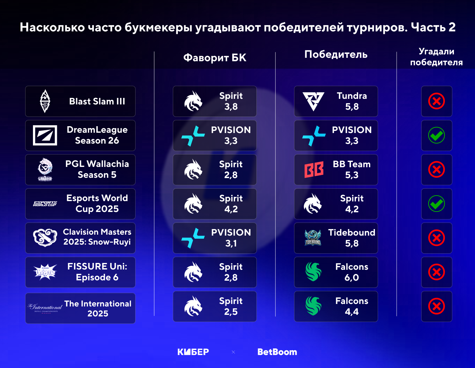 ➢ Всего аналитики угадали трех победителей турниров, но на EWC BetBoom одинаково оценивала вероятность победы Spirit и PARIVISION.