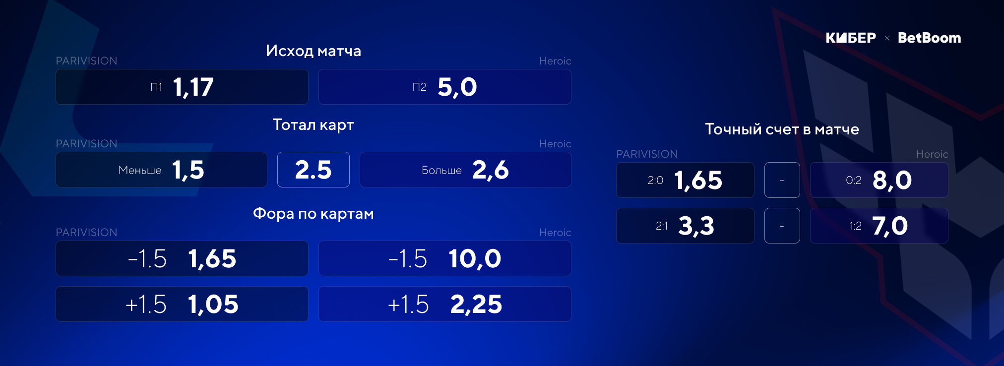Heroic – одна из самых непредсказуемых команд. Это можно заметить по двум играм против PARIVISION на EWC: карты на 30-35 минут сочетались с часовыми. При этом в одном затяжном матче было всего 48 фрагов, а в другом – 90. Сложно что-то прогнозировать, но в этих матчах PVISION сделала FB на четырех из пяти карт. На продолжение тренда можно поставить с коэффициентом 1,68.