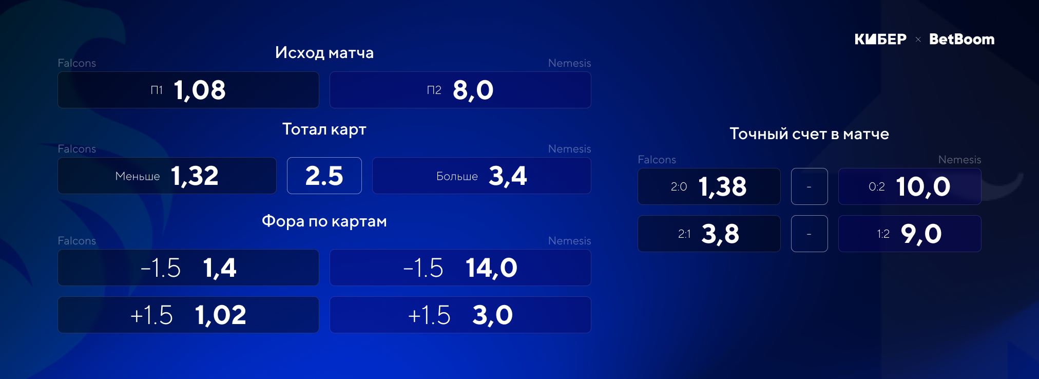 Сложно опираться на статистику Nemesis, ведь команда дебютирует на тир-1 чемпионате. Стоит вдвойне осторожнее подходить к ее цифрам, так как состав не играл официальных матчей с июня. Тем не менее можно отметить, что у пятерки часто получается сделать FB. В матче с Falcons, которые идут последними по этому показателю, такая ставка кажется логичной. На FB от Nemesis можно поставить с коэффициентом 2,1.