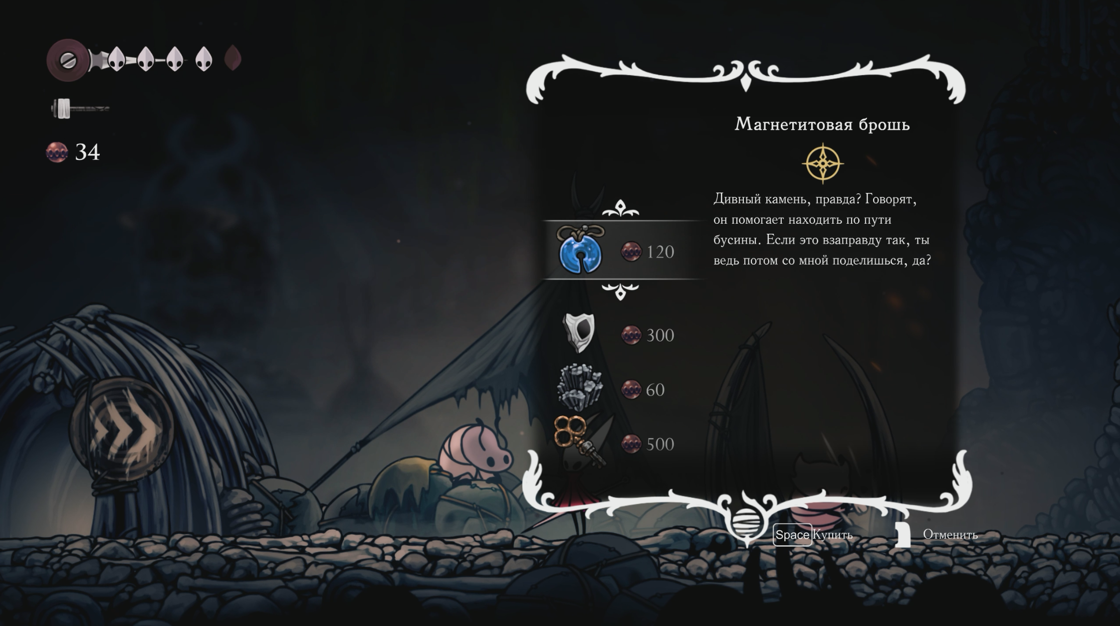● У торговцев в Костяной низине и других локациях – приобретаются полезные предметы: ключи, амулеты и материалы. Для удобного фарма стоит купить у Пебб Магнетитовую брошь (Magnetite Brooch) – она притягивает бусины к Хорнет и не дает им скатываться в пропасти.