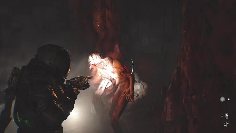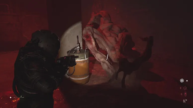 После выхода из безопасной зоны вас ждет знакомство с новой механикой – взрывными канистрами. Стрелять во врагов сразу не обязательно: куда веселее заманить их поближе к красной бочке и устроить эффектный фейерверк. Так вы сэкономите патроны и получите зрелищный бонус. Кстати, канистры бывают разных цветов и размеров – не пропускайте их, особенно в туннеле, где стены покрыты биомассой и врагов будет значительно больше. В такие моменты канистры становятся настоящими спасателями, а не просто декорацией уровня.