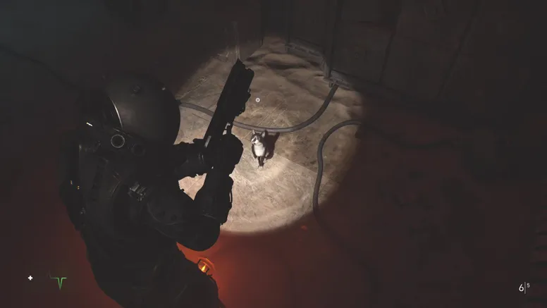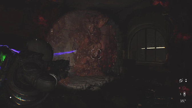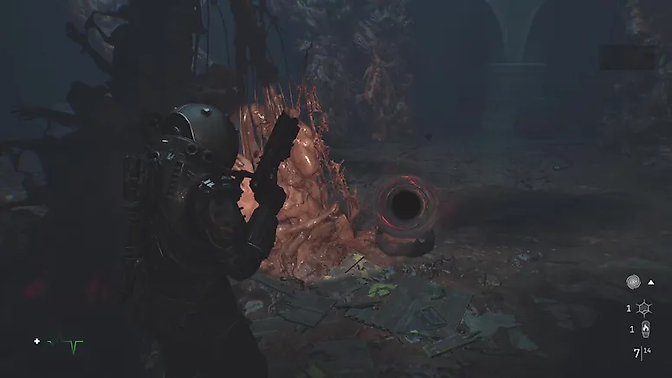 У этой двери вы заметите оранжевое Эхо – яркое воспоминание, которое раскрывает эмоциональный конфликт между Артуром и Габриэлем, спорящих о том, кто из них должен первым войти в эту дверь. Прослушав их разговор, вы узнаете больше об их прошлом и взаимоотношениях. За дверью находится безопасная комната. Внутри вы найдете новый, очень полезный предмет – Карабин «Копье» LK-102. Его система автонаведения делает его невероятно эффективным против слабых, быстрых противников и, самое главное, против тех, кто ползает по стенам или висит на потолке, – именно с такими врагами вы скоро столкнетесь. В комнате с карабином вы также найдете дополнительные боеприпасы, чтобы сразу же опробовать новое оружие в бою.
