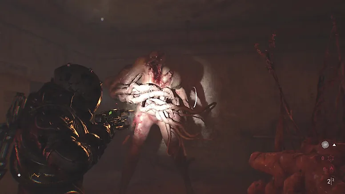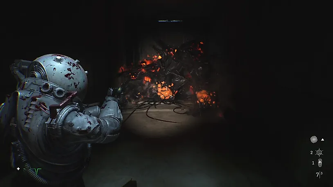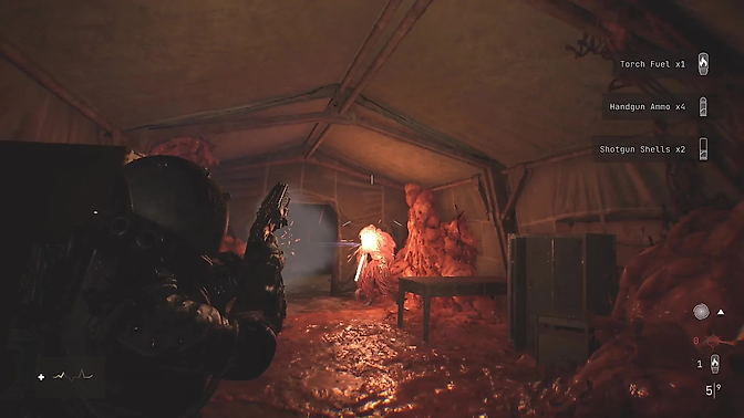 Это существо выглядит как безголовый человек, покрытый черными наростами. Битва будет происходить в большой комнате, где вы сможете прятаться от атак босса и собирать припасы. Ваша задача – сжечь наросты на теле босса, чтобы выстрелить в его уязвимые места, которые находятся на голове, груди и ногах.