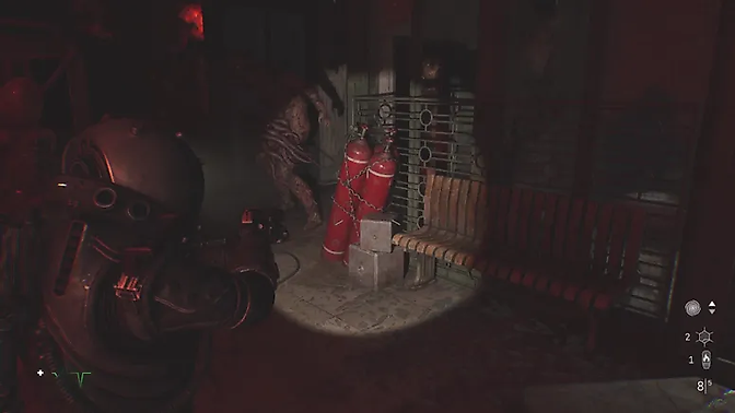 Выйдя из безопасной комнаты вас будет поджидать новый тип врага – «Стена». Эти огромные, медлительные монстры сливаются со стенами и ждут, когда вы подойдете достаточно близко. Они уязвимы к огню, поэтому воспользуйтесь своим факелом или зажигательными патронами, чтобы поджечь их. Двигаясь по коридорам, вы сможете найти много полезных припасов и осмотреть заброшенные вагоны.