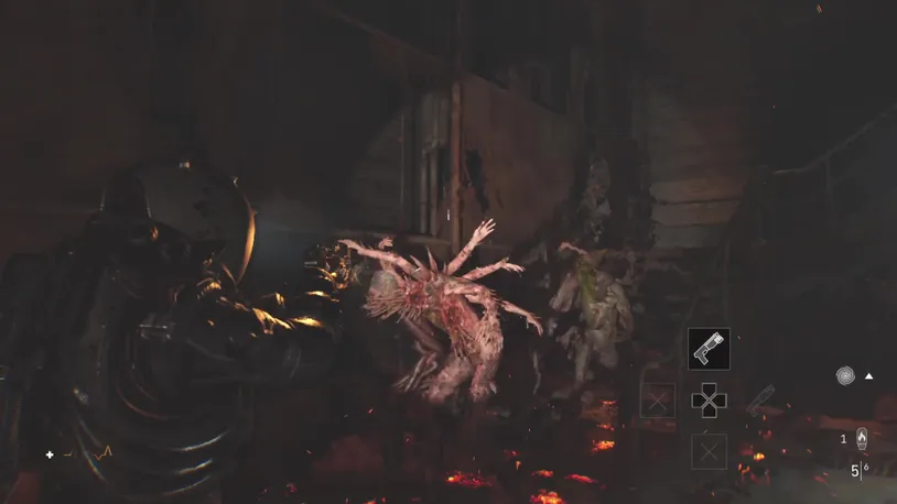 Продолжая путь, вы столкнетесь с новым препятствием – черными наростами биомассы, которые можно сжечь только с помощью Факела. Вы найдете его в диспенсере. Запомните: Факел – это не только инструмент, но и мощное боевое средство. Он позволяет сжигать тела убитых врагов, чтобы предотвратить слияние, а его пламя оглушает противников. В этом же районе вы найдете Металлический лом, еще один крафтовый материал.
