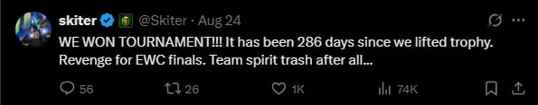 💬 «МЫ ВЫИГРАЛИ ТУРНИР!!! Прошло 286 дней с тех пор, как мы поднимали трофей в последний раз. Реванш за финал EWC. Spirit все-таки мусор».