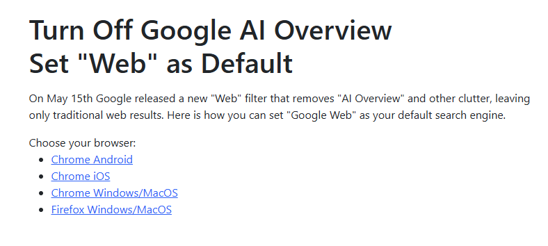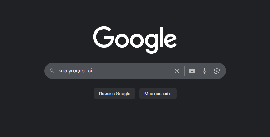 Самый простой – добавлять к каждому поисковому запросу приписку -ai. Это команда для Google, которая буквально означает «Исключи все, что связано с ИИ». В таком случае появится только привычная текстовая выдача со ссылками без нейроответов.