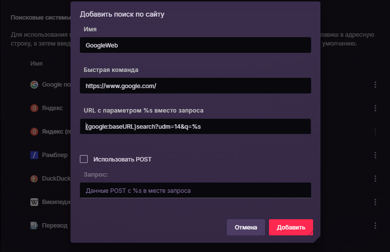 - Скопируйте и введите Google/Web в «Имя», https://www.google.com/ в «Ключевое слово», {google:baseURL}search?udm=14&q=%s в «URL».