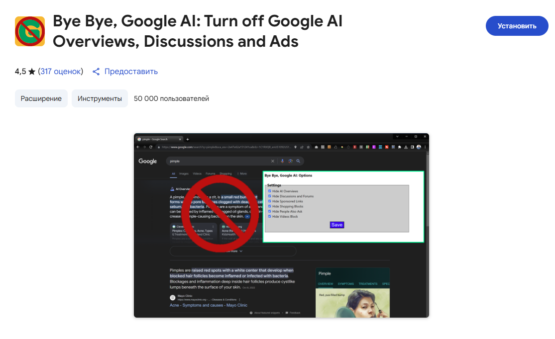 Установите расширение «Bye Bye, Google AI», которое автоматически прячет ИИ-ответы со страницы выдачи Google. Вот как его установить: