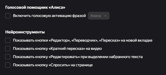 - Найдите вкладку «Нейроинструменты» и уберите галочки в нужном пункте (например, «Показывать нейроподсказки в поиске»).