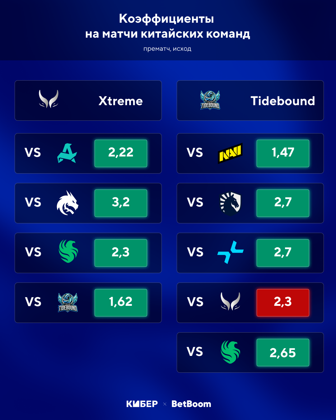 Китайские составы захватили все наше внимание. Казалось, что самый высокий коэффициент будет у Xtreme или Tidebound. Но на первом месте матч из подвала швейцарки – Wildcard против Boom. Это был матч на вылет из корзины 1-3. Проигравшая Boom отправилась домой, а Wildcard – в стыковой матч с PARIVISION.