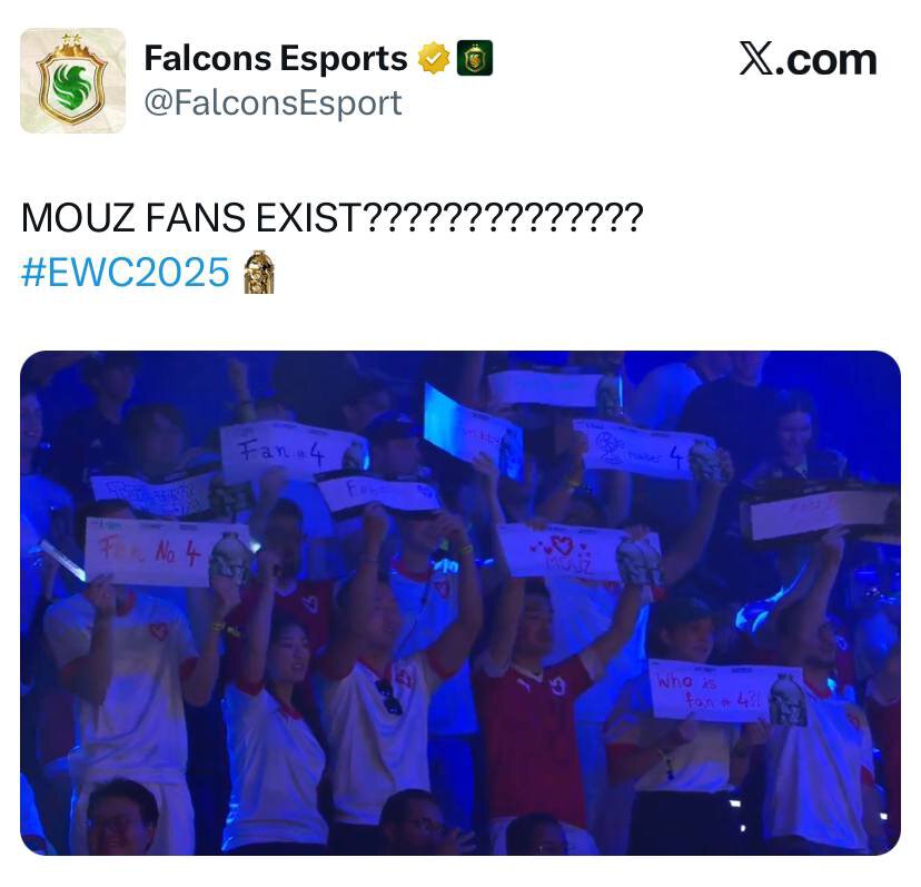 Перевод: «Все 4 фаната Mouz собрались здесь».