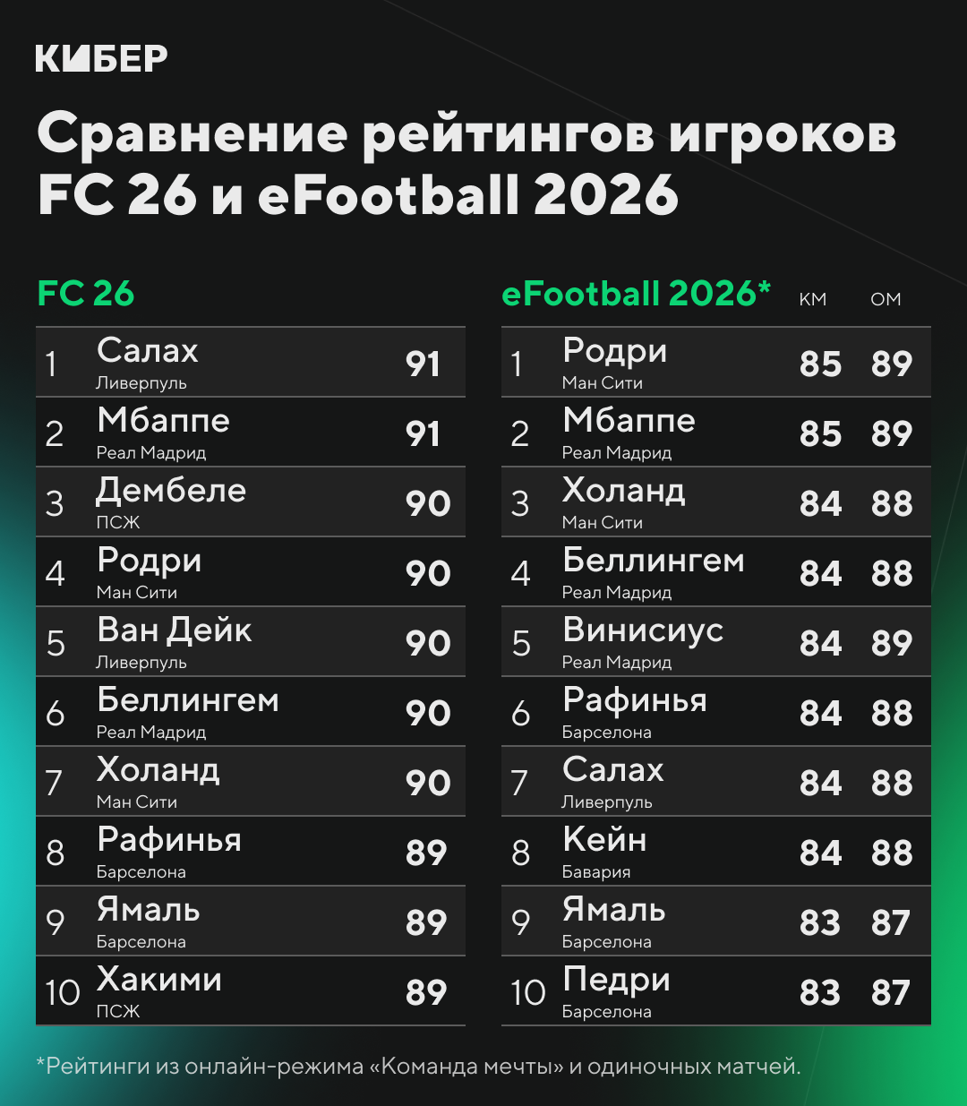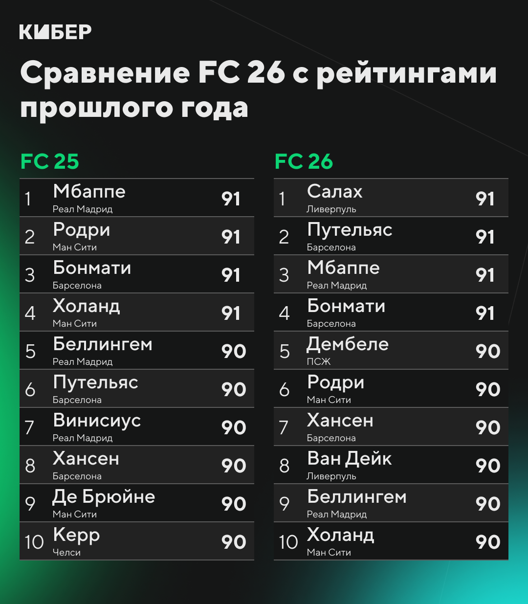 Лучшими игроками нового футсима стали Мохамед Салах и Килиан Мбаппе (по 91). EA отметила чемпионство и личный рекорд египтянина в АПЛ, а французский бомбардир «Реала» покорил разработчиков «Золотой бутсой». В десятку пробились фавориты «ЗМ» из «ПСЖ» и «Барселоны» – Усман Дембеле (90), Рафинья и Ламин Ямаль (по 89).