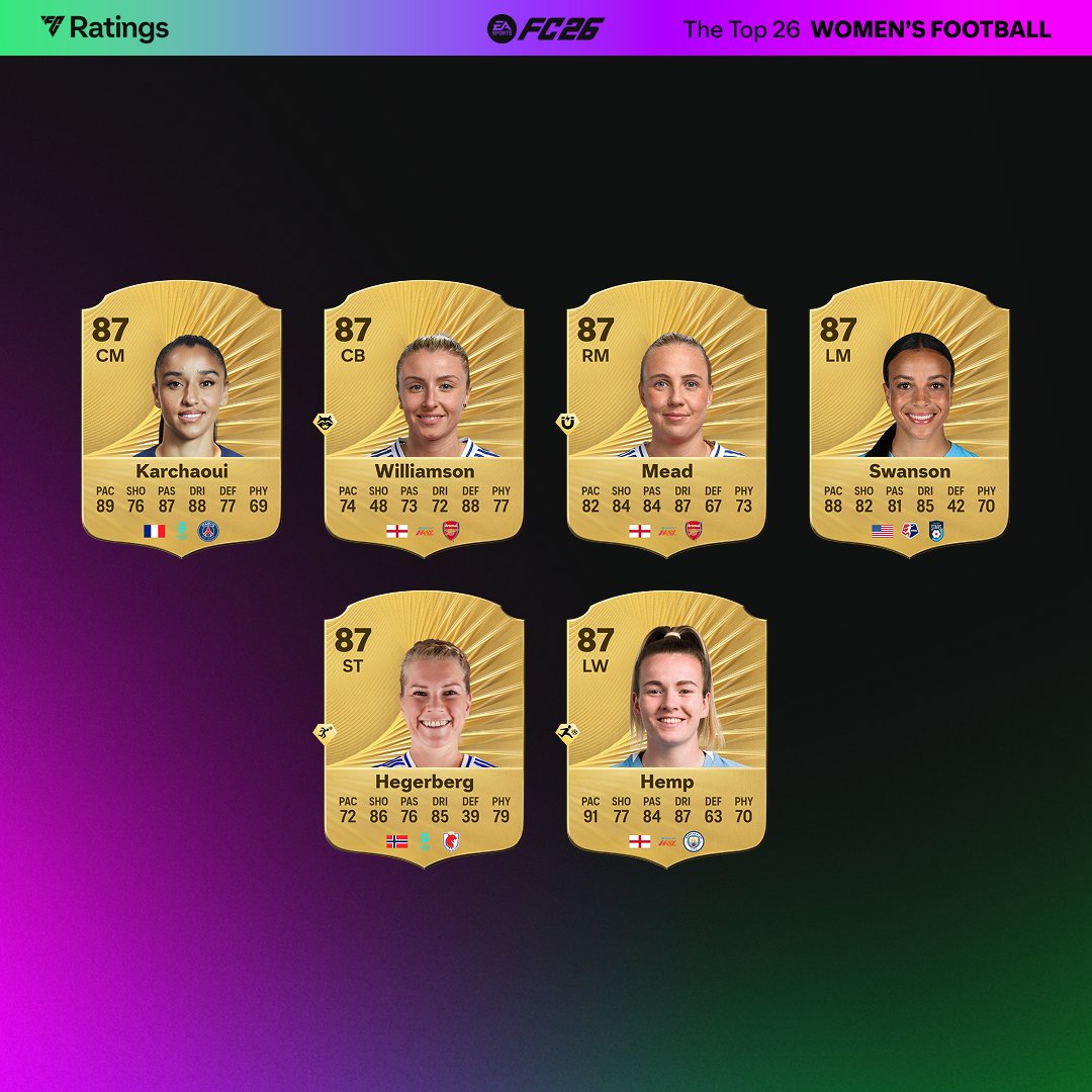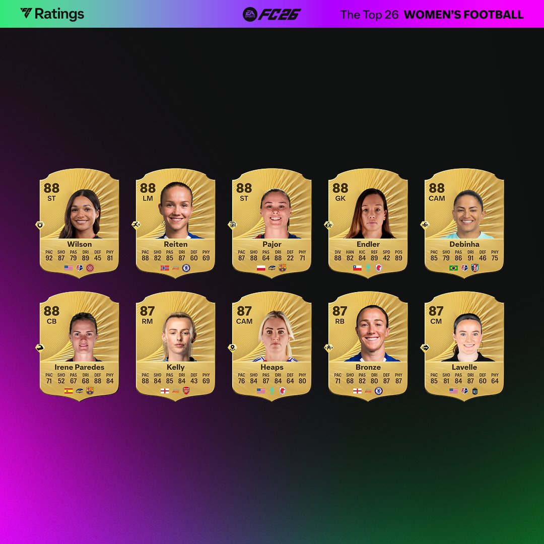 В женском рейтинге FC 26 лидируют футболистки «Барселоны» – Алексия Путельяс, Айтана Бонмати (по 91) и Каролина Хансен (90). К ним подтянулись победительницы ЛЧ из «Арсенала» – Алессия Руссо и Мариона Кальдентей, а еще крупный апгрейд дали лучшей нападающей английской WSL Хадидже Шоу (все по 89).