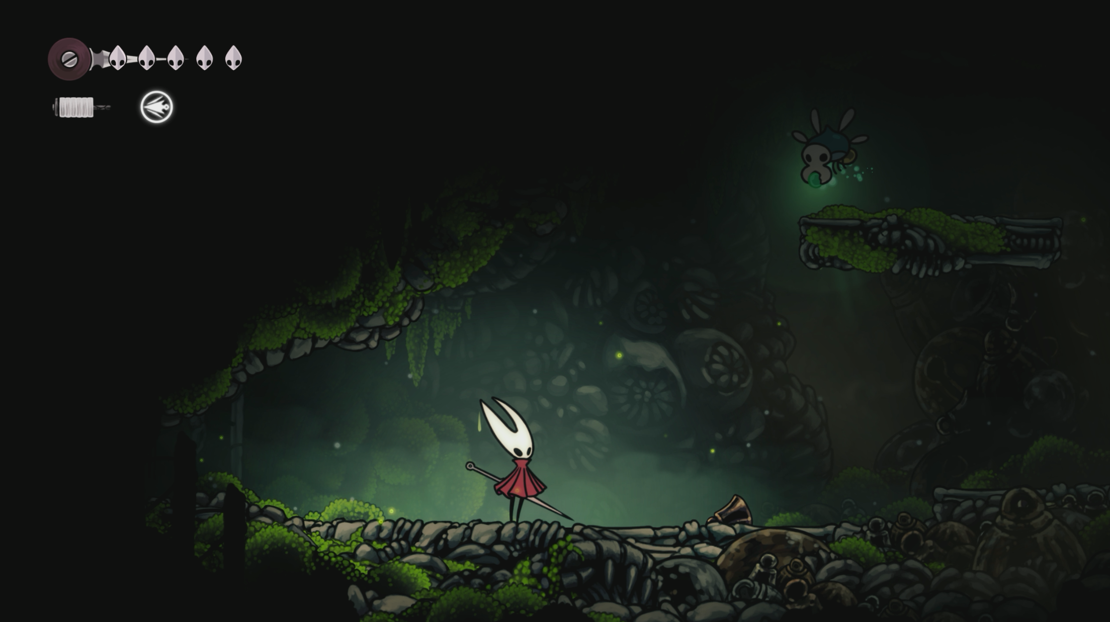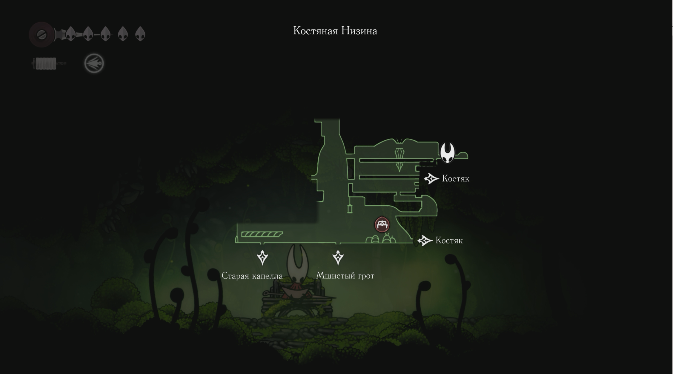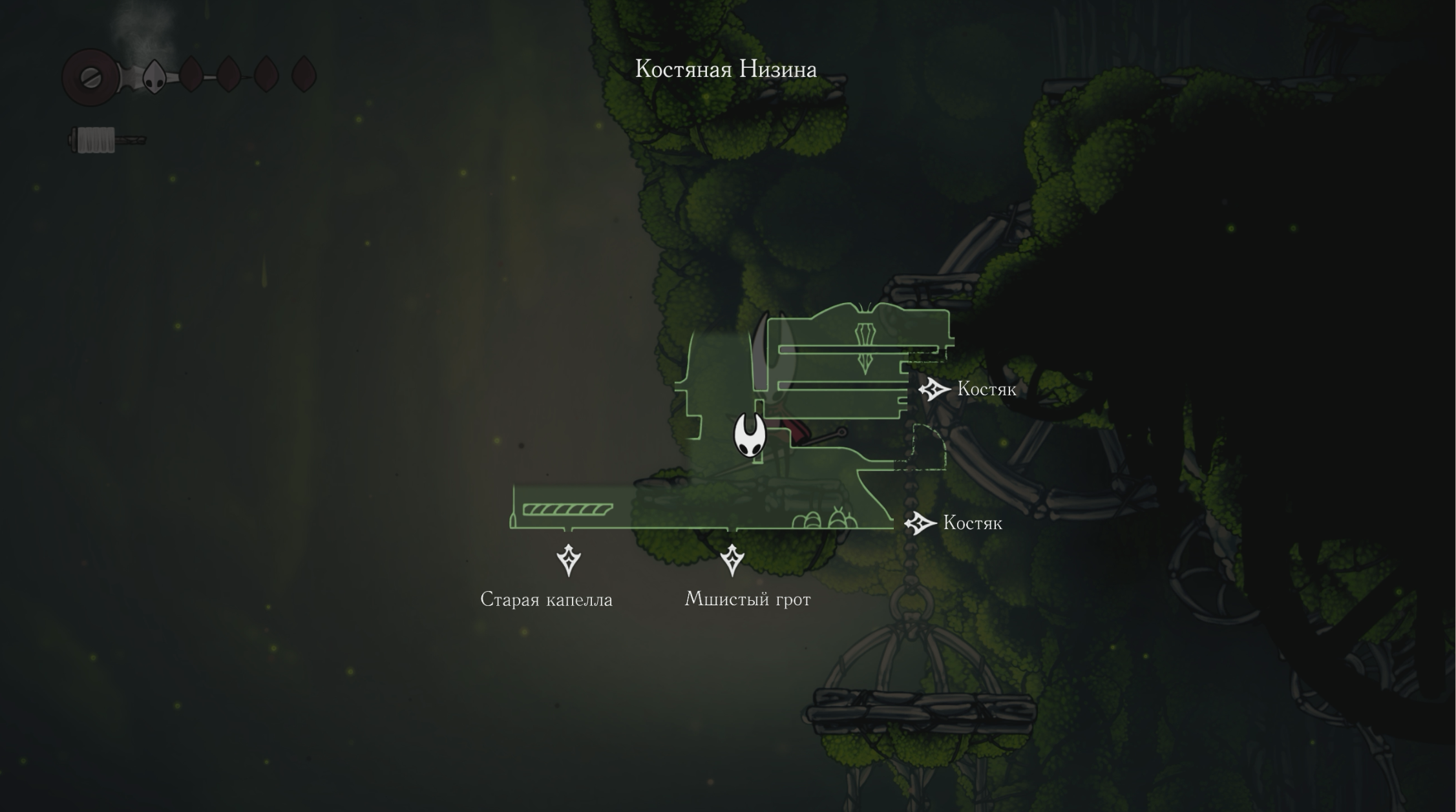 Моховой Друид находится в пещере в правой верхней части локации Костяная Низина (Bone Bottom). Чтобы попасть к нему, сначала нужно получить способность Шелковое копье (Silkspear) – она находится в большой комнате прямо перед входом в пещеру Друида.