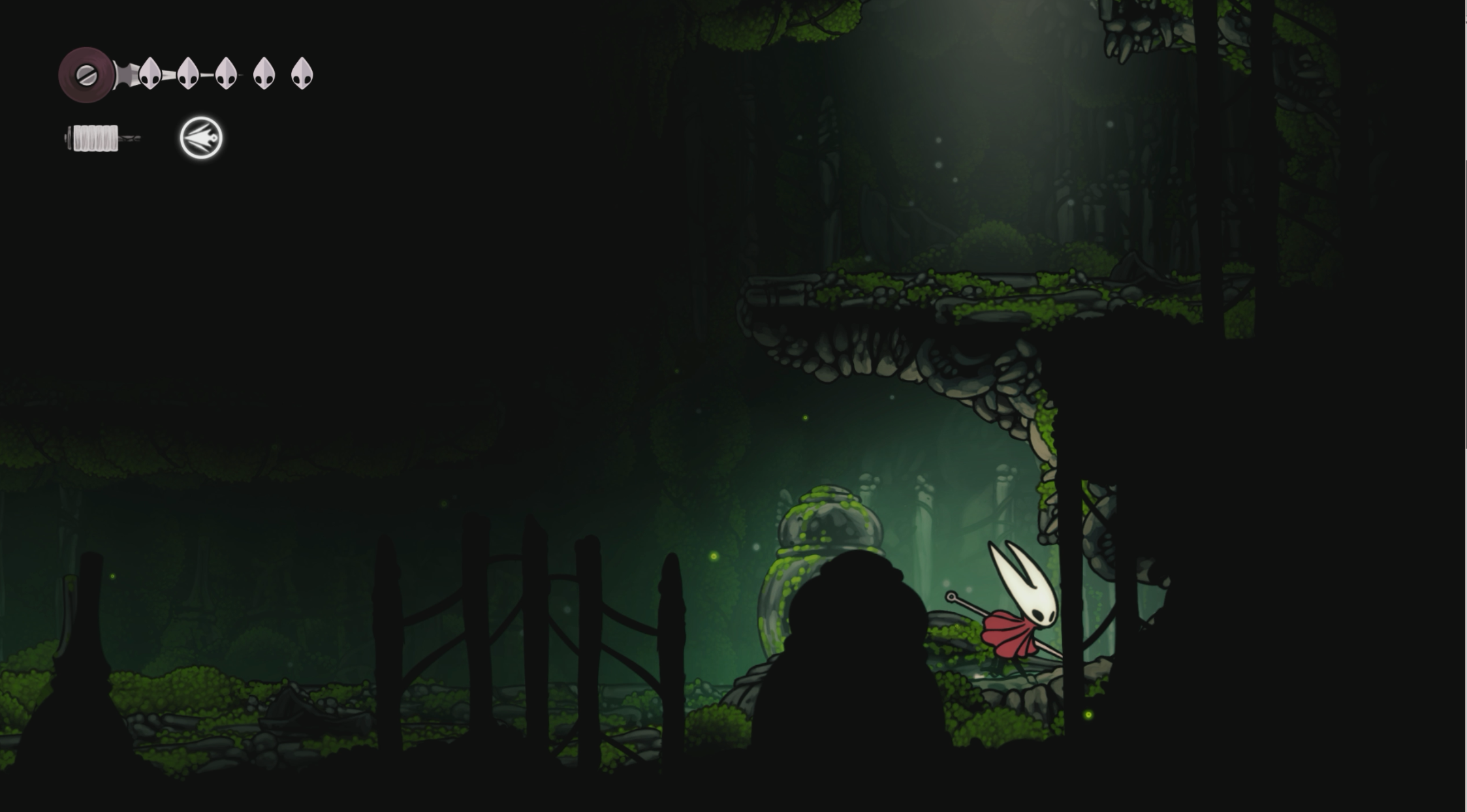 После получения копья спуститесь на нижний уровень той же комнаты и идите максимально вправо. Увидите шелковый барьер – разрежьте его новой способностью. Продолжайте двигаться вправо через разрыв, и попадете в пещеру.