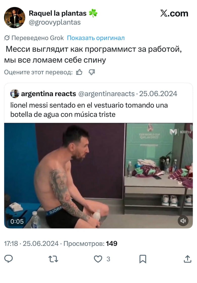 Пользователи соцсетей раскопали старое видео с ЧМ-2022, где Лео сидит сгорбленный в раздевалке. Теперь Месси не только восьмикратный обладатель «Золотого мяча», но и айтишник, креветка и даже Голлум из «Властелина колец».