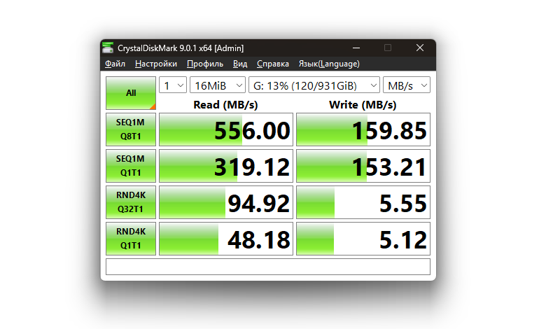 Ориентироваться стоит на самые высокие значения в строке SEQ1MQ8T1 (последовательная скорость чтения/записи), так как они наиболее важны для большинства повседневных задач.