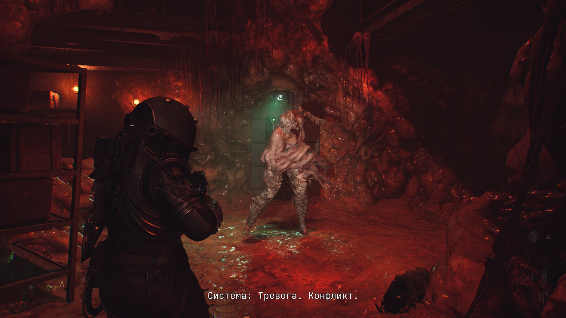 Еще страшнее, что в Cronos не бывает слабых врагов. Даже базовый монстр убивает четырьмя ударами. А ведь он в любой момент может усилиться: отыскать труп сородича, впитать его биомассу и стать локальным боссом. Был рядовым противником, а теперь вырос в размере, начал плеваться кислотой, получил броню и превратил обыденную стычку в кошмар.