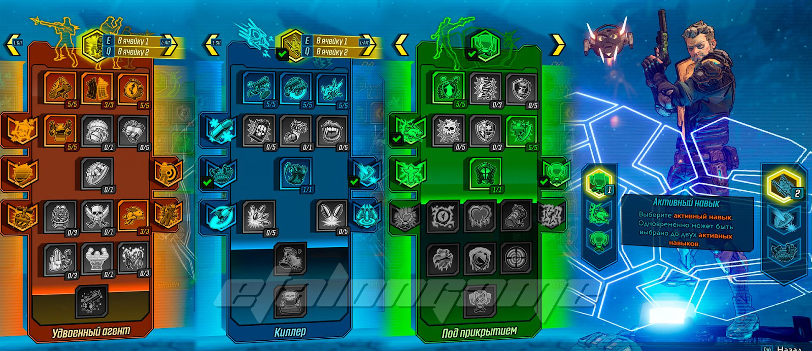 Главные направления прокачки для Зейна — это ветки «Двойной агент» и «Под прикрытием». В первой он получает доступ к цифровому клону, который отвлекает врагов и при необходимости может быть мгновенно заменен на самого героя. Во второй — усиливаются щиты, повышается выживаемость и открываются умения, позволяющие долго находиться под обстрелом. В связке эти две ветки дают баланс между атакой и защитой, делая Зейна удобным для соло-прохождения и командной игры.