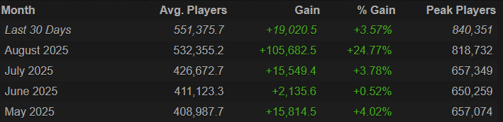 В августе в Доте одновременно находились в среднем 532 тысячи человек. Это очень много, таких показателей не было уже шесть лет. Повышения на 105 тысяч людей за месяц и вовсе не случалось никогда, это самый резкий скачок в истории.