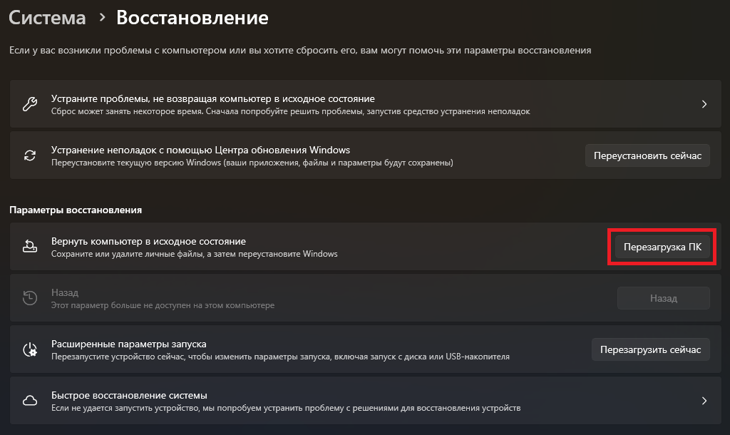 В открывшемся окне найдите раздел «Параметры восстановления» и нажмите кнопку «Перезагрузка ПК» напротив пункта «Вернуть компьютер в исходное состояние».