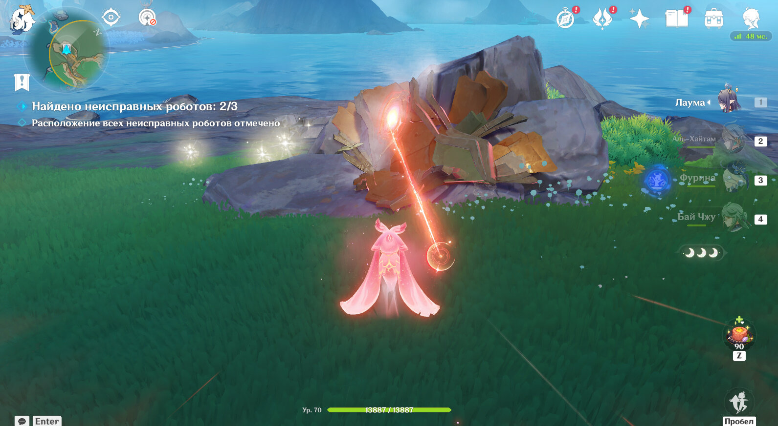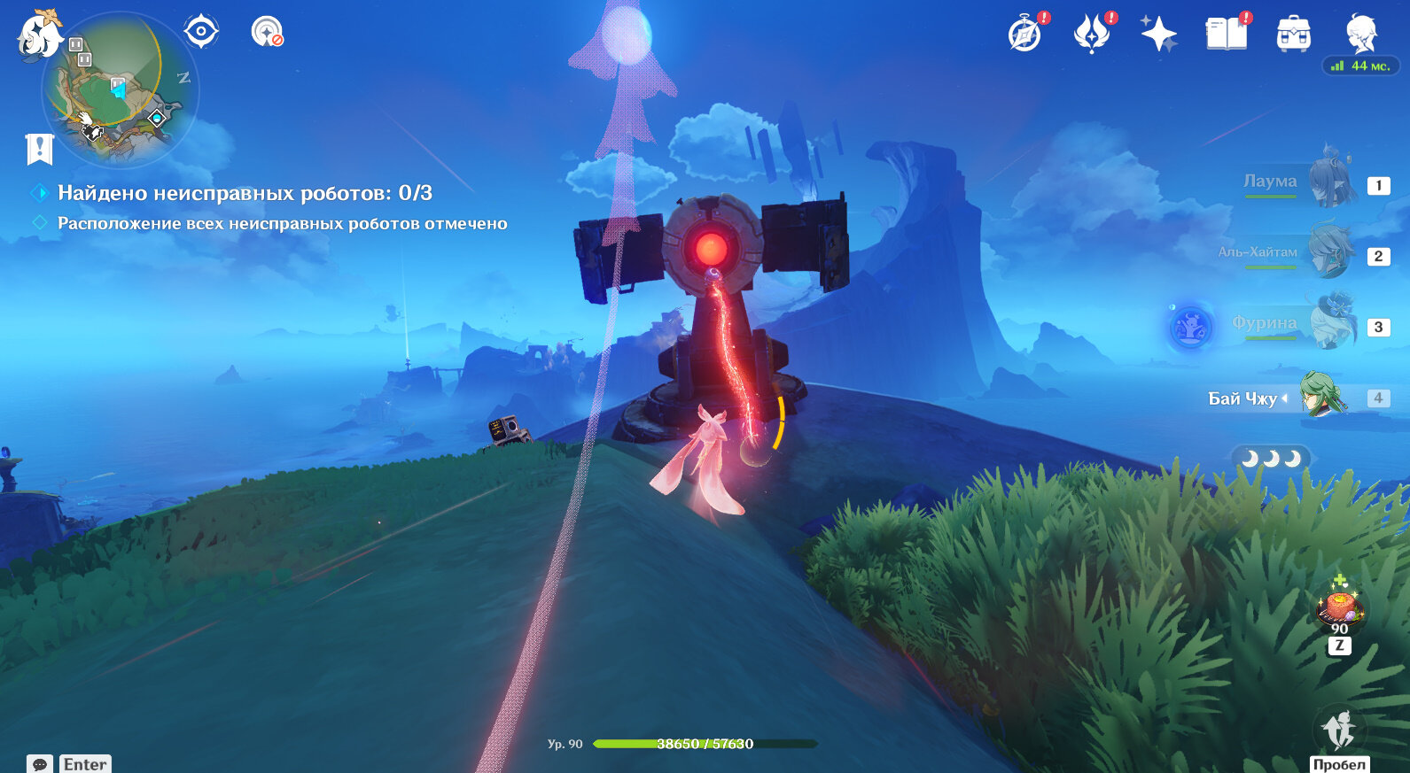 В этом испытании робот всего один, но нужно будет сражаться с двумя волнами опричников. Когда Паймон скажет, что робот хочет помочь, возьмите камень силой куувяки и направьте его в солдата Фатуи. Потом будет босс-файт – робот убьет его сам.