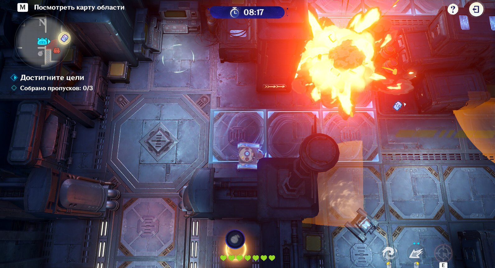 В этом испытании большая часть противников – дроны. Их можно сбивать бомбами, которые рассыпаны по всей территории. Первый пропуск можно добыть как раз таким путем.