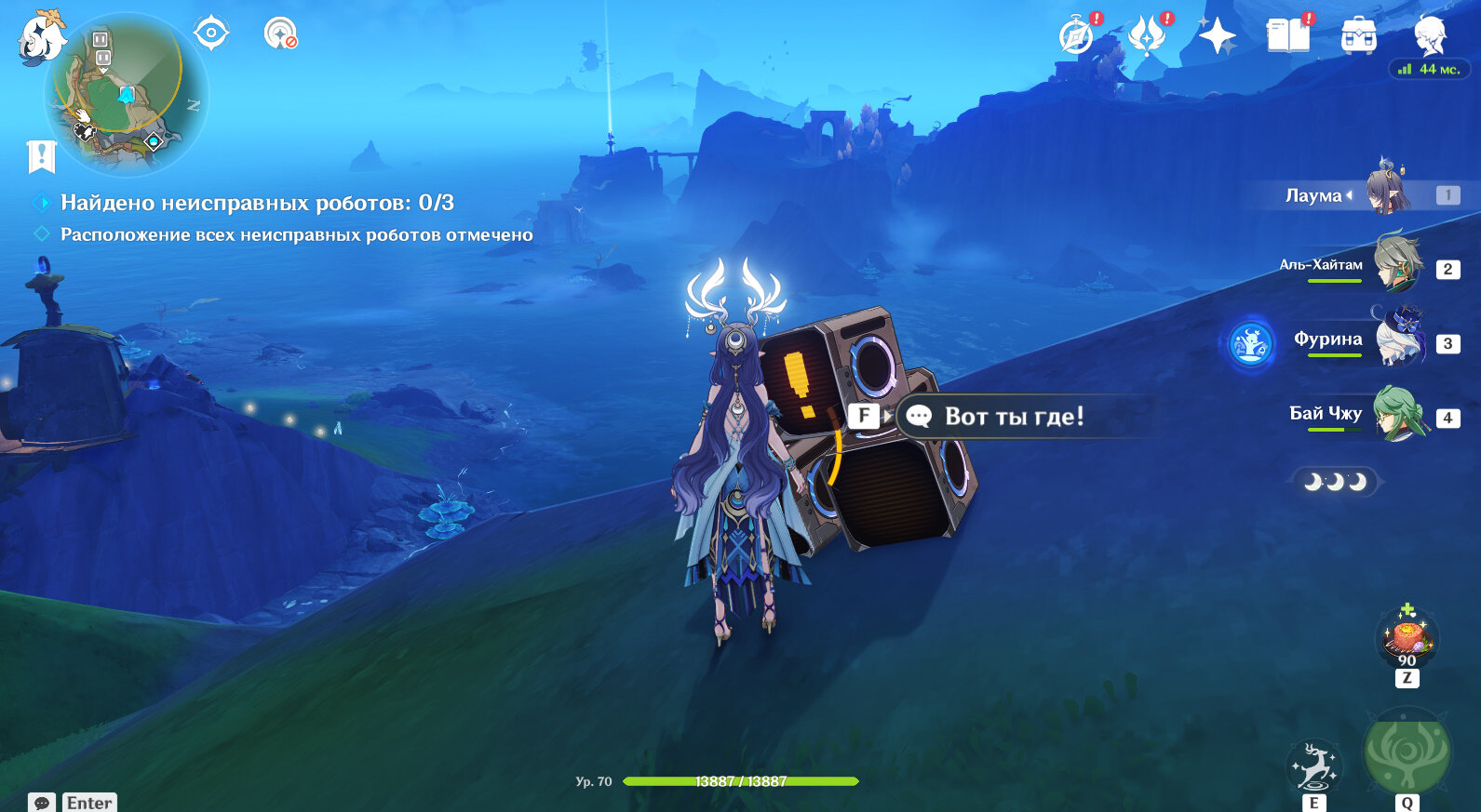 После этого соберите все частицы, чтобы отметились все расположения неисправных роботов. С первым можно будет поговорить только после уничтожения машины.