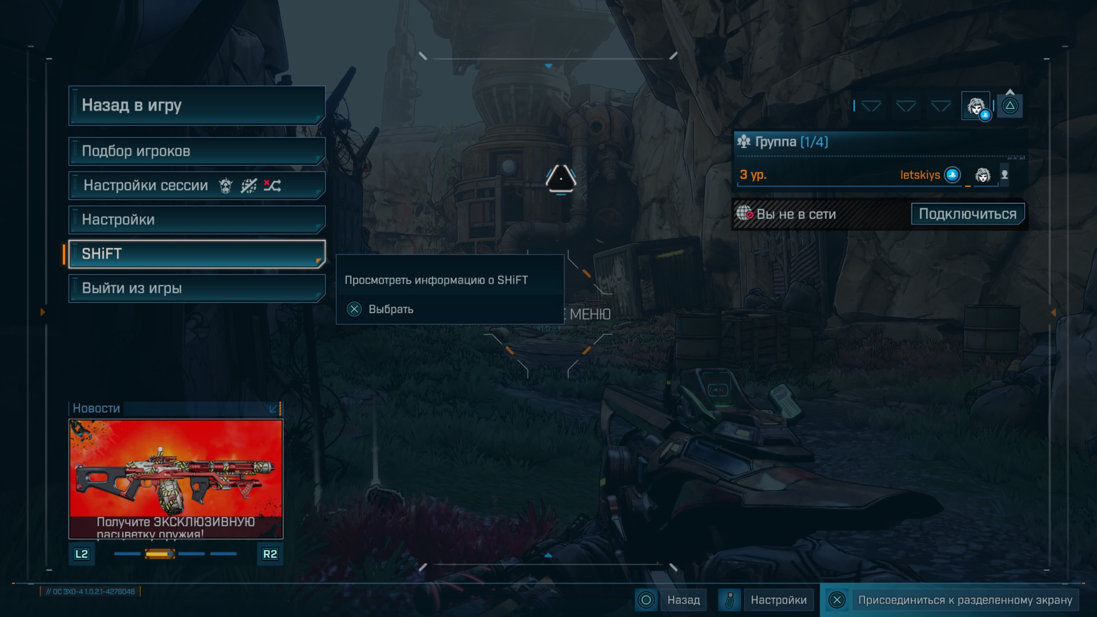 - Поставьте игру на паузу и выберите вкладку SHIFT. Там можно ввести код и получить награду. Главное, прикрепите учетную запись Gearbox.