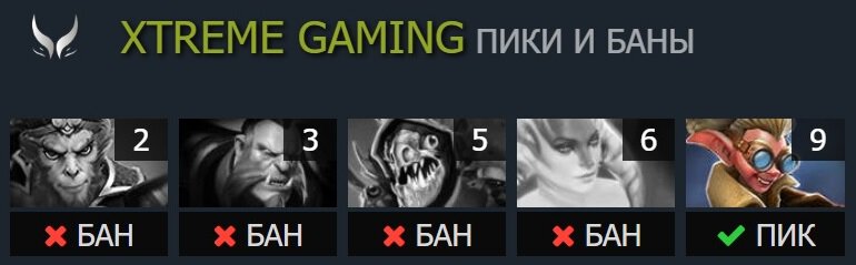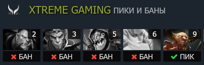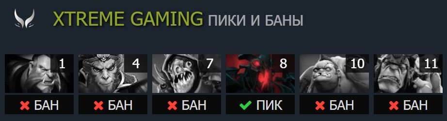 А теперь смотрим баны Чжана «Xiao8» Нина в финале нижней сетки Xtreme Gaming против PARIVISION: