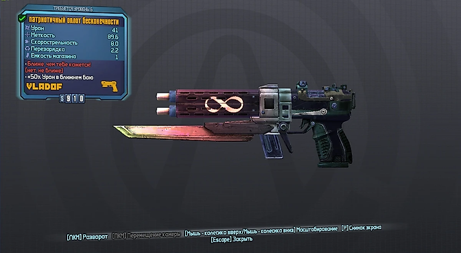 Оплот бесконечности – легендарный пистолет производства Vladof, знаменитый тем, что никогда не расходует боезапас. Он может выпадать из Доктора Милосерда в Трех Рогах-Долина или из Золотого Голема в дополнении «Крошка Тина штурмует Обитель Дракона». Несмотря на низкий урон и скорострельность, это оружие крайне полезно в ситуациях, когда у игрока заканчиваются патроны.