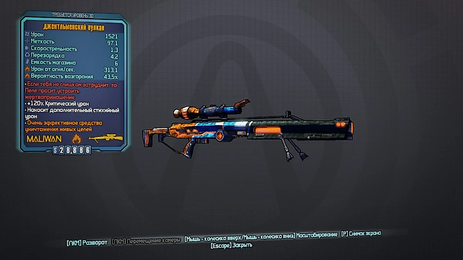 Этот ПП имеет гораздо лучшие характеристики, чем большинство аналогичных моделей, и быстро достигает пика эффективности. При стрельбе от бедра точность постепенно растет, но при прицеливании она сразу становится идеальной. Сучонок особенно полезен для персонажей, полагающихся на критические попадания. Красный текст оружия является отсылкой к песне Элтона Джона «The Bitch is Back», а русская локализация связана с популярным интернет-мемом. Его высокое качество делает его фаворитом среди игроков, предпочитающих скорострельное и точное оружие.