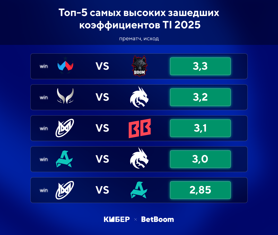 На следующем FISSURE Universe: Episode 6 состав взял реванш в финале, так что к Инту пятерка подходила в статусе фаворитов. BetBoom отправила их в группу преследователей Spirit с коэффициентом 4,4 на победу наряду с PARIVISION и Liquid.