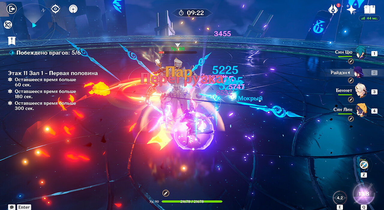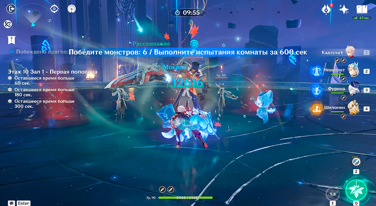 В первой половине девятого зала ожидают новые крейсеры Фатуи различных стихий и размеров. Возьмите в отряд стяжку, чтобы было проще наносить урон всем соперникам сразу. Возьмите любую удобную команду.