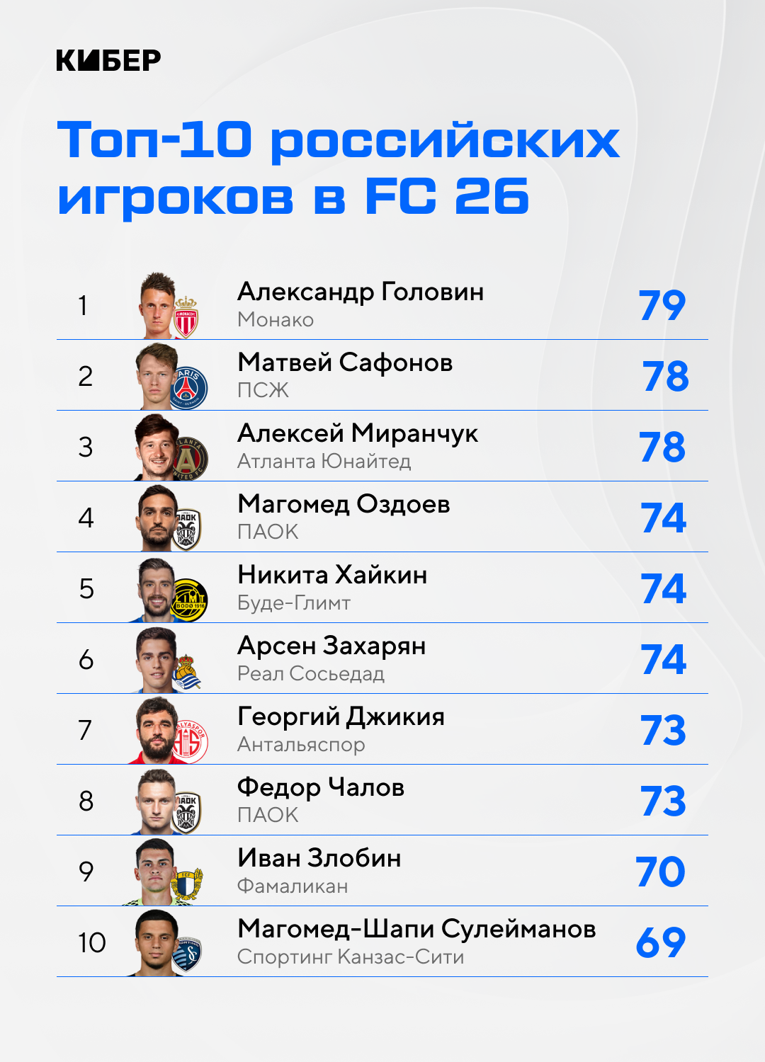 ● Александр Головин – лучший российский футболист FC 26. Лидер «Монако» провел не слишком удачный год и потерял сразу два балла, но EA снова не нашла ему альтернативы. А вот у Konami хавбека обошел вратарь «ПСЖ» Матвей Сафонов.