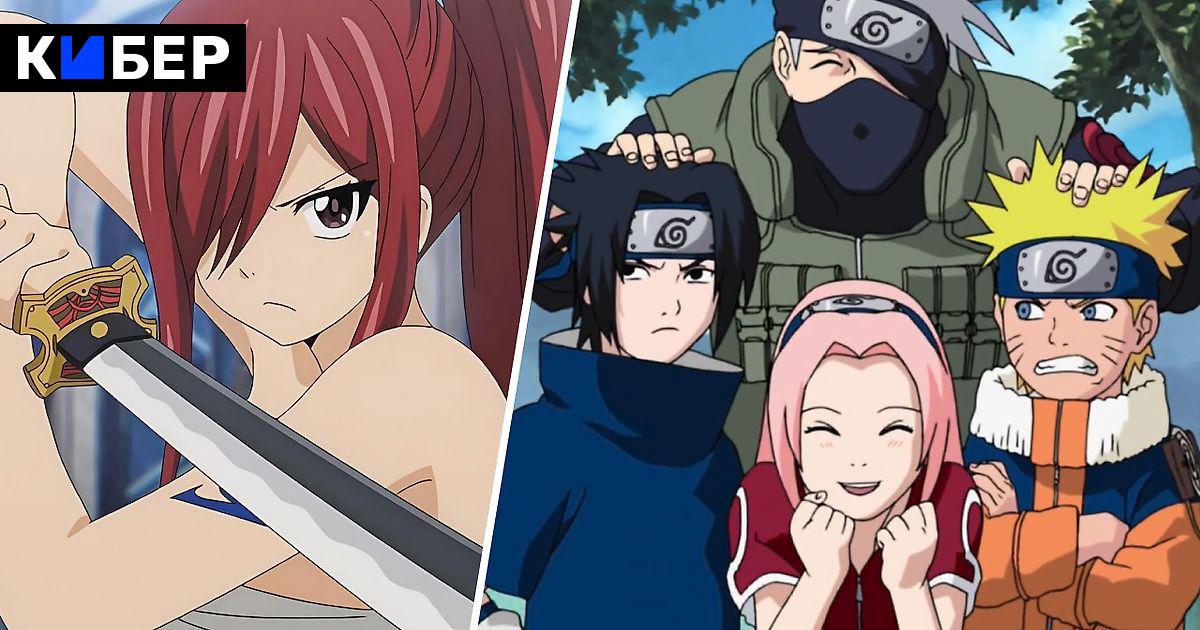 Популярные герои аниме с красными волосами: Эрза Скарлет, Киришима, Карин и Гаара.