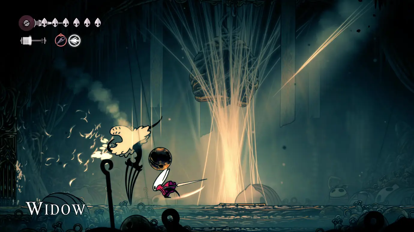 Вдова обитает в Звонвилле и известна своей связью с паутиной. Перед сражением рекомендуется подготовиться: пополнить здоровье и взять расходники. Первая стадия сводится к атакам через натянутые нити и падению колоколов, траектория которых отмечена заранее. Важно парировать прыжками и копить шелк для лечения. На второй фазе бой становится агрессивнее, но стратегия остается прежней: ждать момента, когда босс раскрывается. Победа приносит умение «Иглончель». Этот паук подчеркивает, сколько боссов в Hollow Knight Silksong связаны с уникальными наградами.